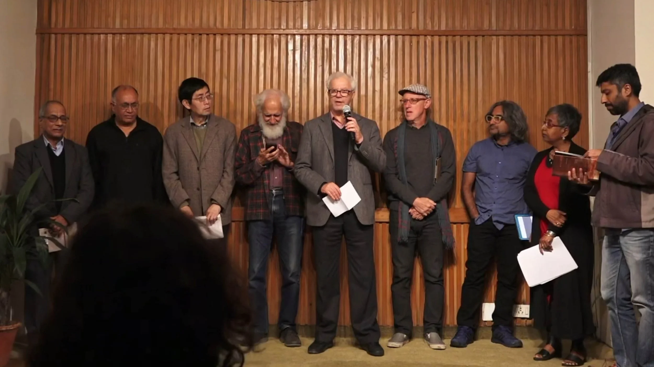 In this brief reading are (from left to right): Manglesh Dabral, I. Allan Sealy, Bei Dao, Arvind Krishna Mehrotra, Mohammed Bennis, Sergio Chejfec, Vivek Narayanan, Sharmistha Mohanty and Rahul Soni.